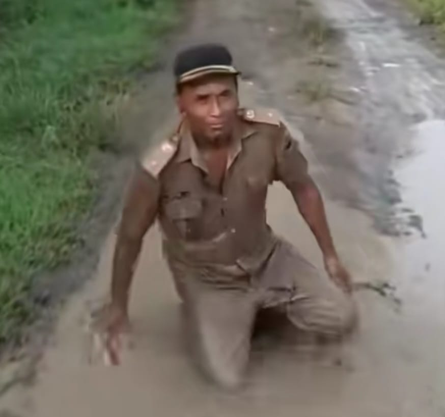 Kepala Desa Ngepringan, Sunarso, melakukan aksi mandi di kubangan lumpur di badan jalan yang rusak parah, sebagai bentuk protes dan tuntutan agar jalan segera dibangun mulus.