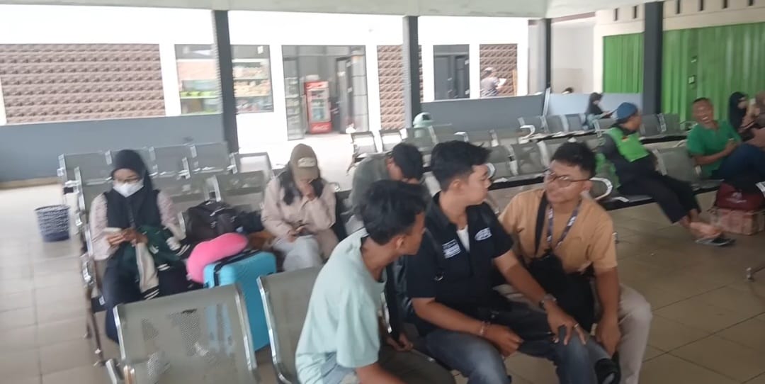 Di tengah teriknya cuaca siang hari, mereka tampak berdiskusi ringan di kursi-kursi terminal, saling menyemangati sebelum keberangkatan.
